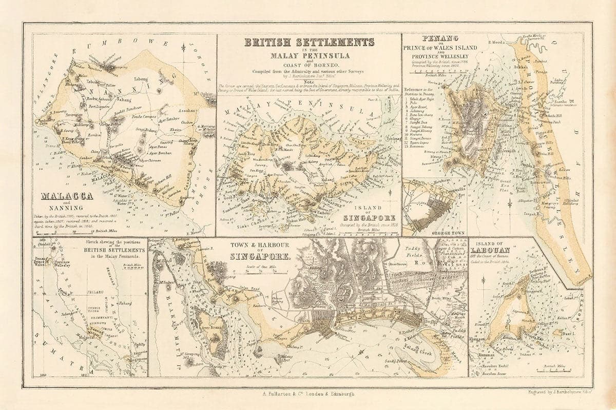 This is a delightful, rare, handcoloured map of the "British Settlements in the Malay Peninsula", originally published by Fullarton & Co in 1860. Old maps of southeast Asia are particularly rare, particularly high quality maps like these from the colonial era.