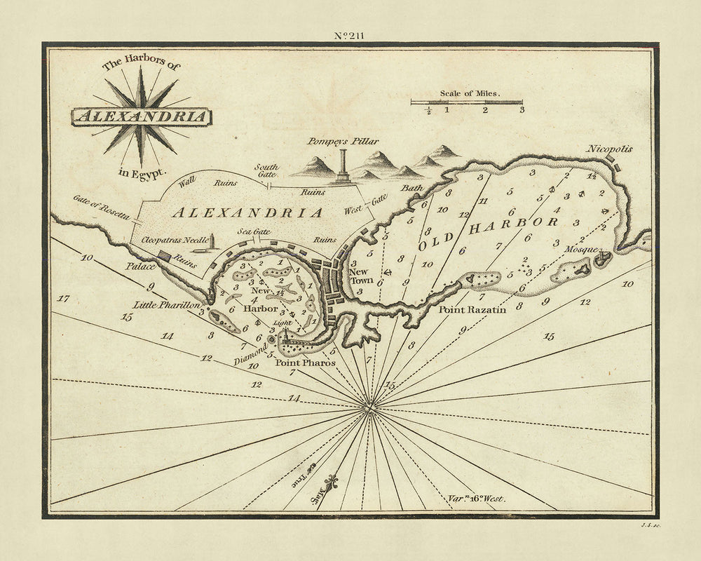 The chart is rich with historical landmarks, offering more than just navigation aid; it serves as a historical document outlining key features such as the Pharos Lighthouse—one of the Seven Wonders of the Ancient World—and the bustling Great Harbour, which was Alexandria’s main maritime hub. It also details the Old Harbour, used by smaller vessels, and the Canal of Alexandria, linking the Great Harbour to the Nile, thus weaving a narrative of a city that was both a protective fortress and a beacon of ancient trade and exchange.