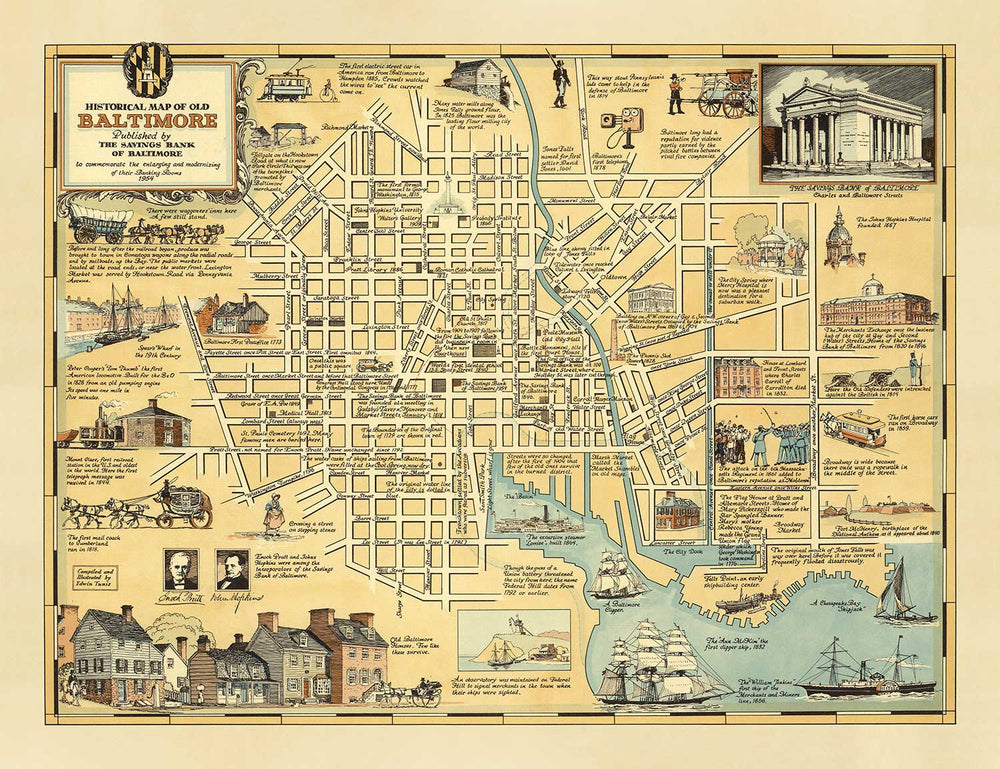 Old Historical Map of Baltimore in 1954 by Edward Tunis: Downtown, Johnstown, Little Italy, Otterbein, Port of Baltimore