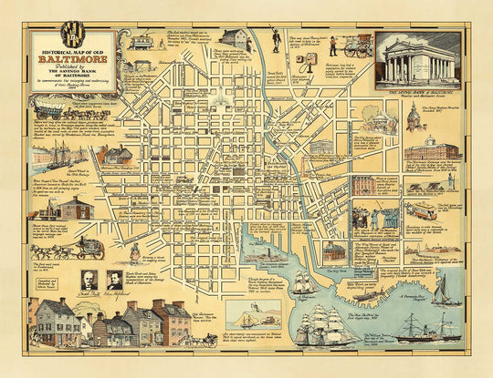 This map of Baltimore highlights prominent 19th-century events, people, and locations. The Savings Bank of Baltimore published this map just a few years after a state constitutional amendment, which prevented any further expansion of the city boundaries,