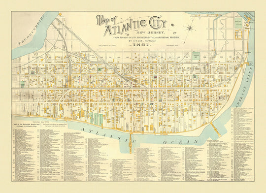 An early plan map of Atlantic City, New Jersey, known for its casinos, beaches, and historic Boardwalk, which opened in 1870 and was the first in America. The Boardwalk stands out as the only yellow street on the entire map.