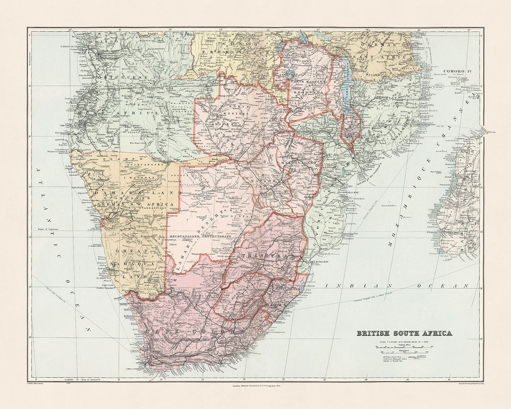 As a country map, 'British South Africa' provides an intriguing perspective on the region during a period of significant historical change. It captures the vastness of the British Empire's African holdings, showcasing the scale and complexity of managing such a diverse range of territories. This map, therefore, is not just a geographical representation, but a historical artifact, a narrative of the British Empire's influence and reach in Africa. It is a fascinating piece for anyone interested in historical geography, colonial history, or the intricate tapestry of Africa's past.