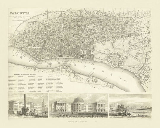 The map is highly detailed, with a wealth of information about the city's streets, buildings, and landmarks. The mapmaker has taken great care to accurately depict the city's layout, and the map is a valuable resource for anyone interested in the history of Calcutta. The map also includes a number of vignettes, which provide additional information about the city's most important buildings and landmarks.