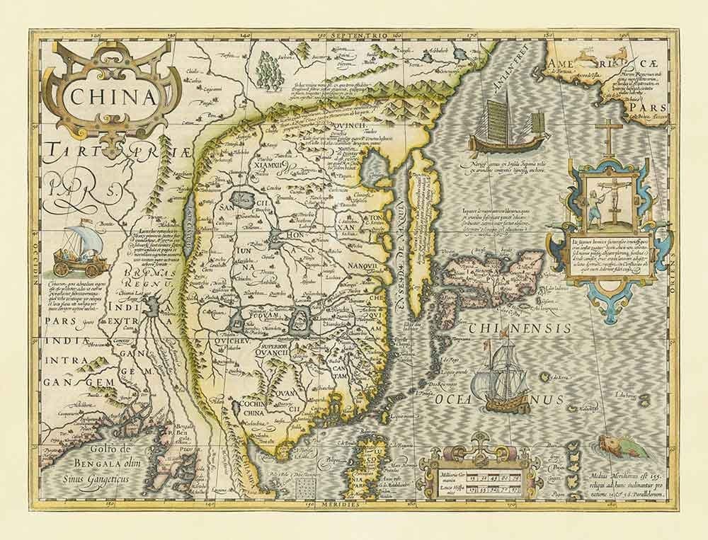 A truly magnificent map of China from 1606 by Dutch master mapmaker Jodocus Hondius - possibly the finest old map of China ever created. Much of East Asia can also be seen on this map, including Korea as an island (!), Japan, Philippines, and even a bit of northwestern North America.