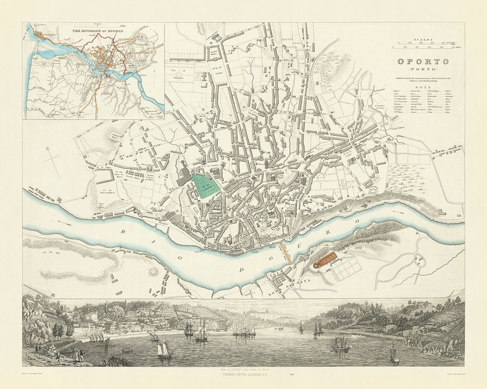 Immerse yourself in the rich tapestry of Porto with the "Antique Map of Porto, Portugal," a masterpiece produced in 1870 by the Society for the Diffusion of Useful Knowledge (SDUK). This map is not just a navigational tool but a historical document that captures Porto during a pivotal era of industrialization. The map features a meticulously detailed plan of the city, highlighting significant neighborhoods such as Bairro Alto, Cedofeita, and Miragaia. Each area is depicted with such precision that one can almost hear the bustling streets and see the vibrant life of 19th-century Porto.