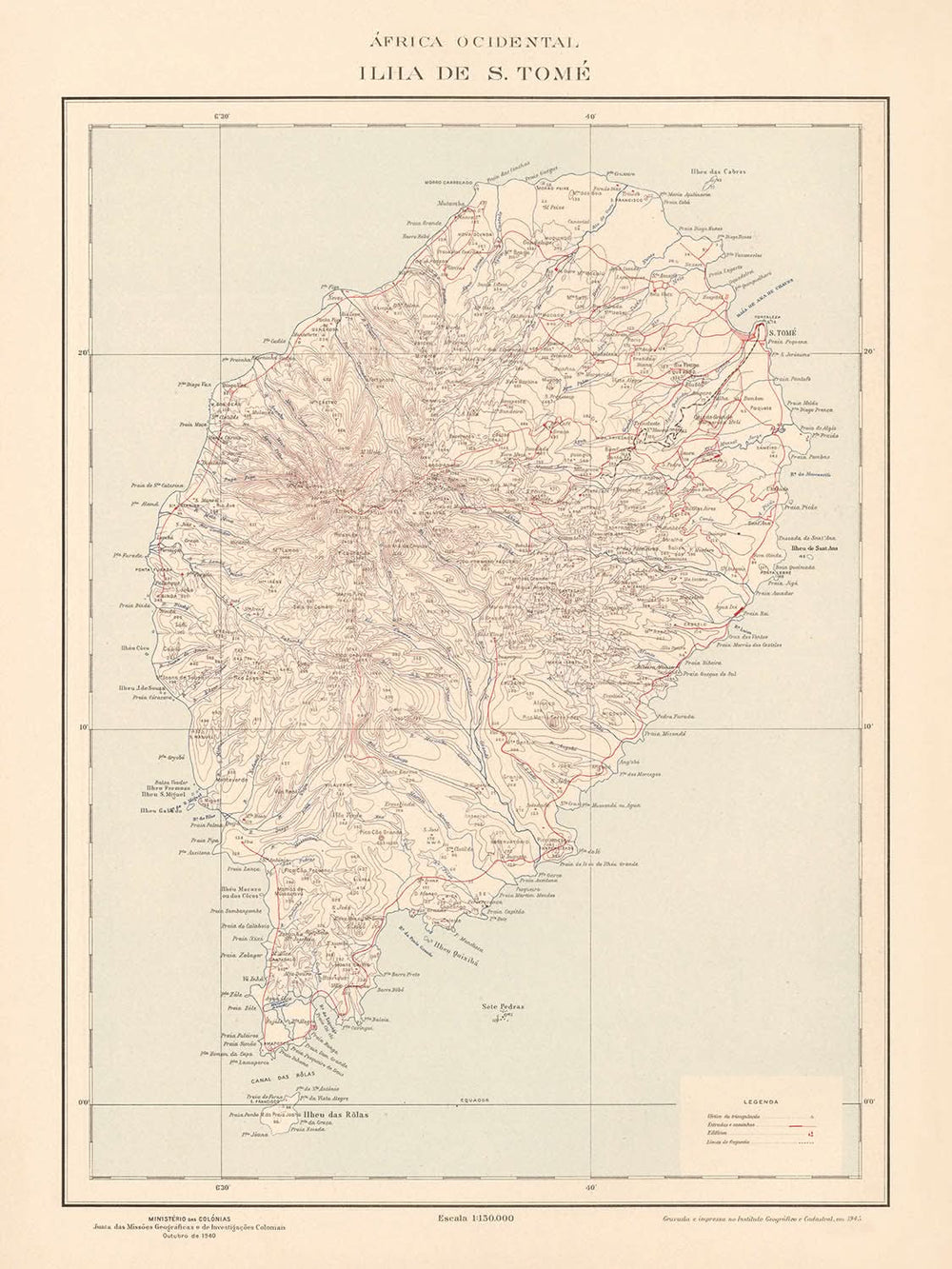 The "África Ocidental Ilha de S. Tomé" map, crafted in 1945 by the esteemed Portugal Ministério das Colónias, offers a captivating glimpse into the cartographic sophistication of the mid-20th century. This exquisite map is part of a larger atlas that was a monumental achievement of the Estado Novo regime, under the leadership of António de Oliveira Salazar. The atlas, known for its scientific and cartographic precision, was designed to showcase Portugal's overseas territories and the nation's historical voyages of discovery and expansion. This map of São Tomé is a testament to the regime's commitment to mapping and data visualization, reflecting both historical and contemporary geographical knowledge.