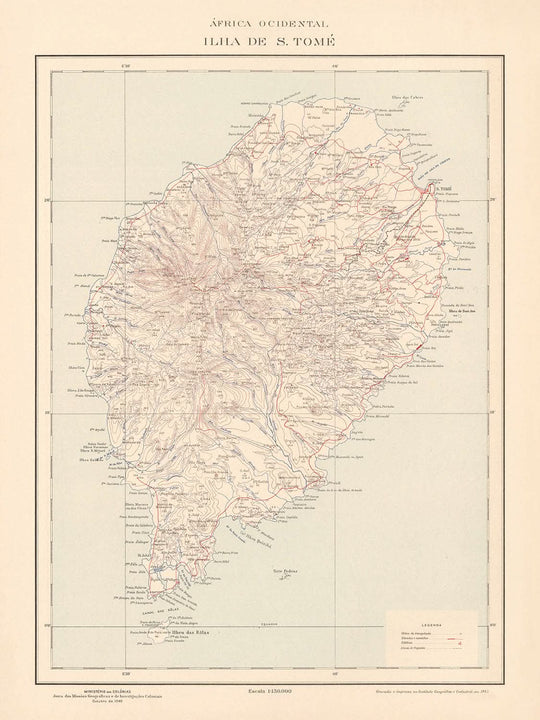 Overall, the "África Ocidental Ilha de S. Tomé" map is a remarkable piece of cartographic history, offering a rich tapestry of information about the island's geography, settlements, and historical significance. It stands as a testament to the artistry and precision of mid-20th-century mapmaking, providing a unique perspective on a region that played a pivotal role in Portugal's colonial narrative.