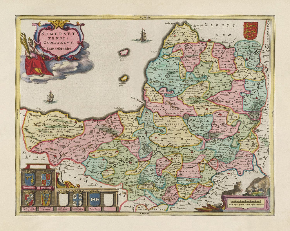 Some of the towns, villages and places clearly visible in this old map of the county of Somerset include: Bath, Portishead, Bristol, Weston-super-Mare, Taunton, Yeovil, Frome, Bridgwater, Clevedon, Glastonbury, Chard, Longleat, Wells and many more. But of course, many of them are spelt in their Early Modern English forms.