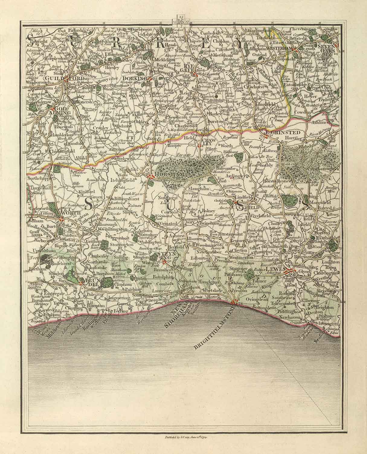 This wonderful old map of Sussex and Surrey was originally published in 1794. It was created by John Cary.