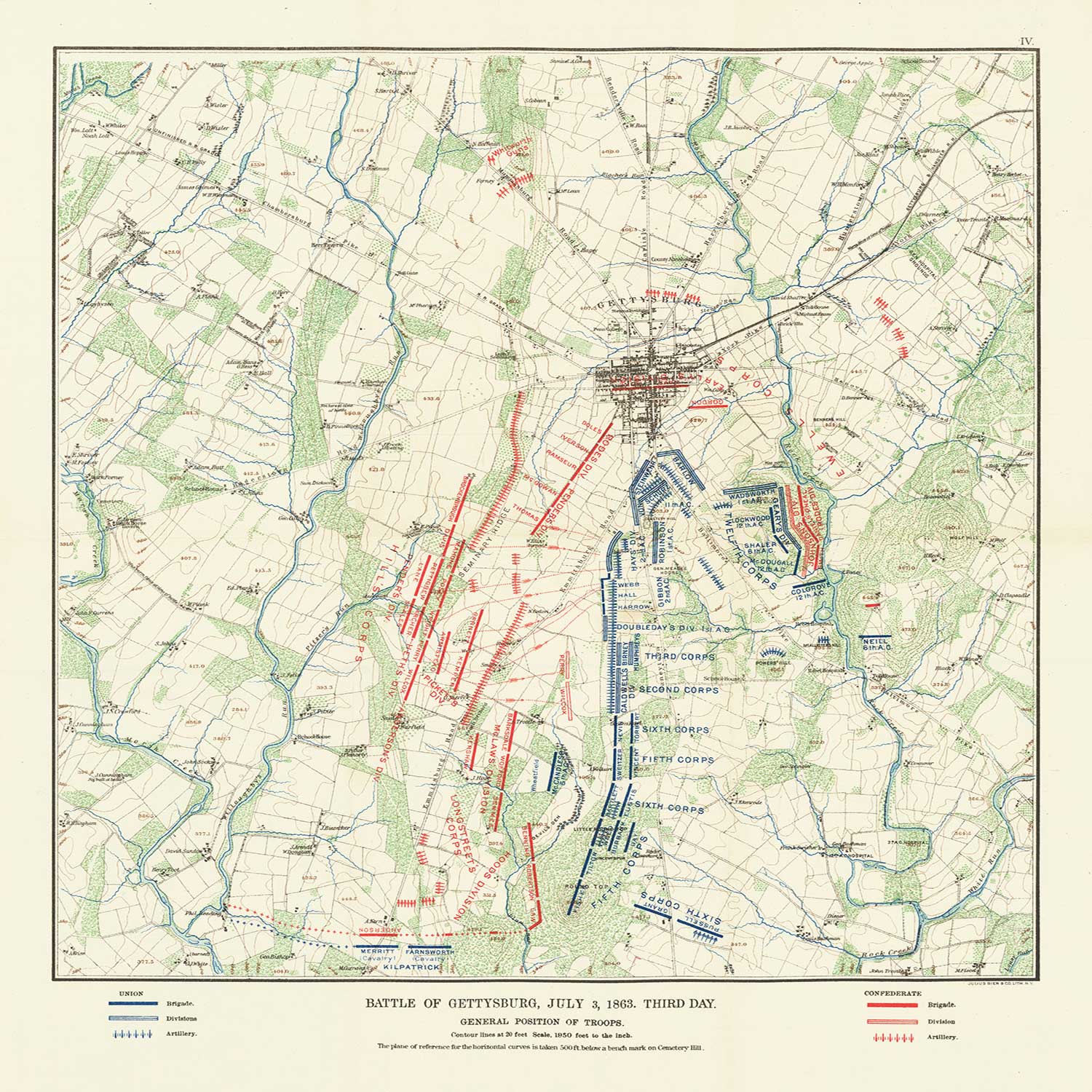 If you’re looking for something slightly different, another option would be this amazing map of the Battle of Gettysburg by Barclay Rubincam in 1953.