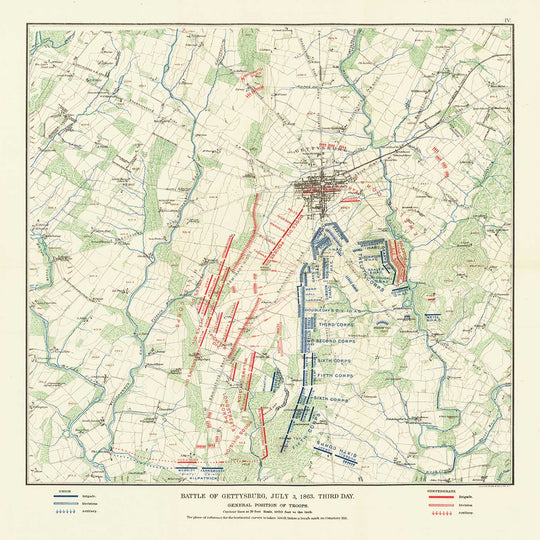 Old Map of the Battle of Gettysburg in 1900 by Julius Bien: North vs. South, Confederacy vs. Union Civil War Chart