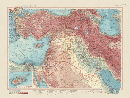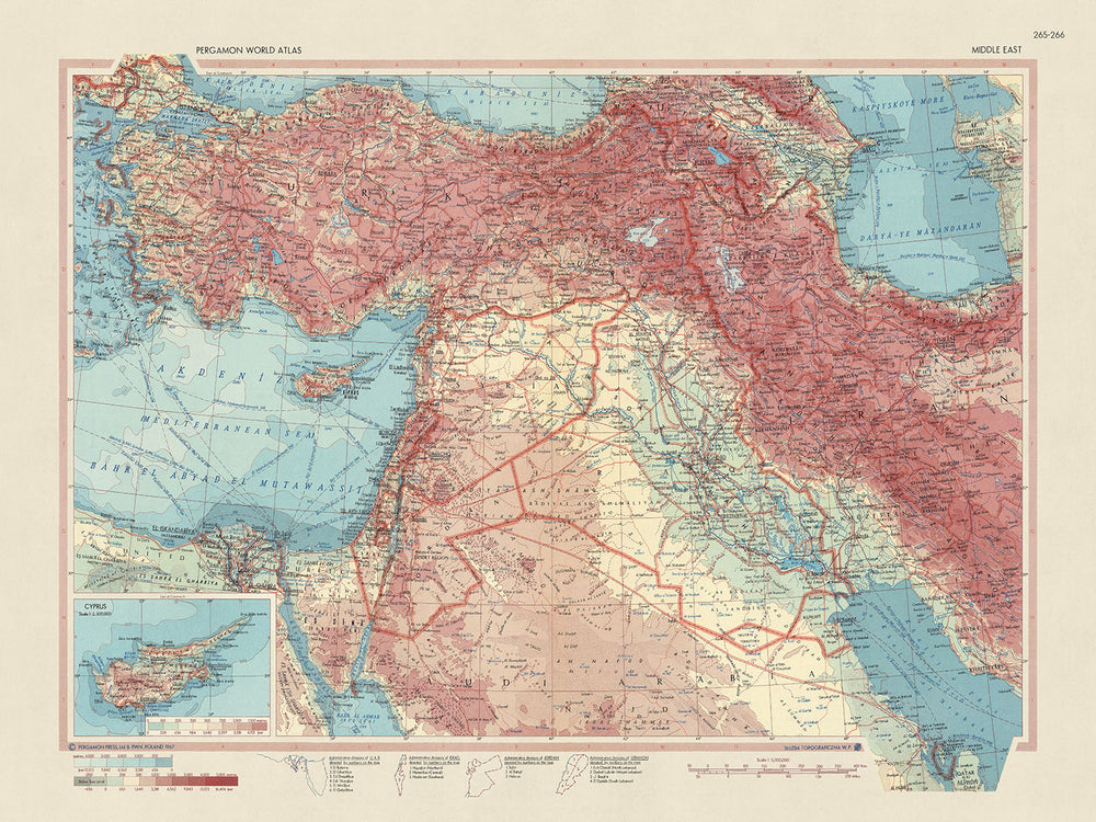 A captivating representation of the Middle East, this 1967 map, originally published by the Polish Army Topography Service, is a testament to the rich history and complex geopolitics of the region. It offers a detailed political and physical depiction, providing an in-depth understanding of the geographical nuances and political subdivisions of various countries. The map's scope extends to Qatar in the south and Cairo in the west, encapsulating a vast area of intrigue and historical significance. The inclusion of an inset of Cyprus further enhances the map's comprehensiveness, ensuring a complete portrayal of the region.