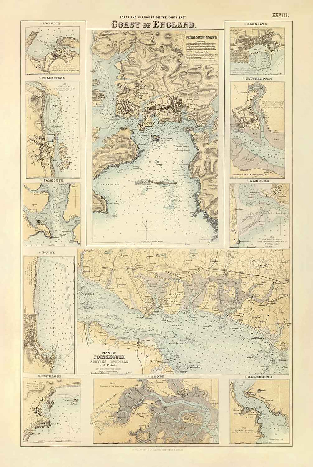 Old Map of the Ports & Harbours in South East of England, 1872 by Fullarton: Margate, Dover, Falmouth, Folkestone, Portsmouth