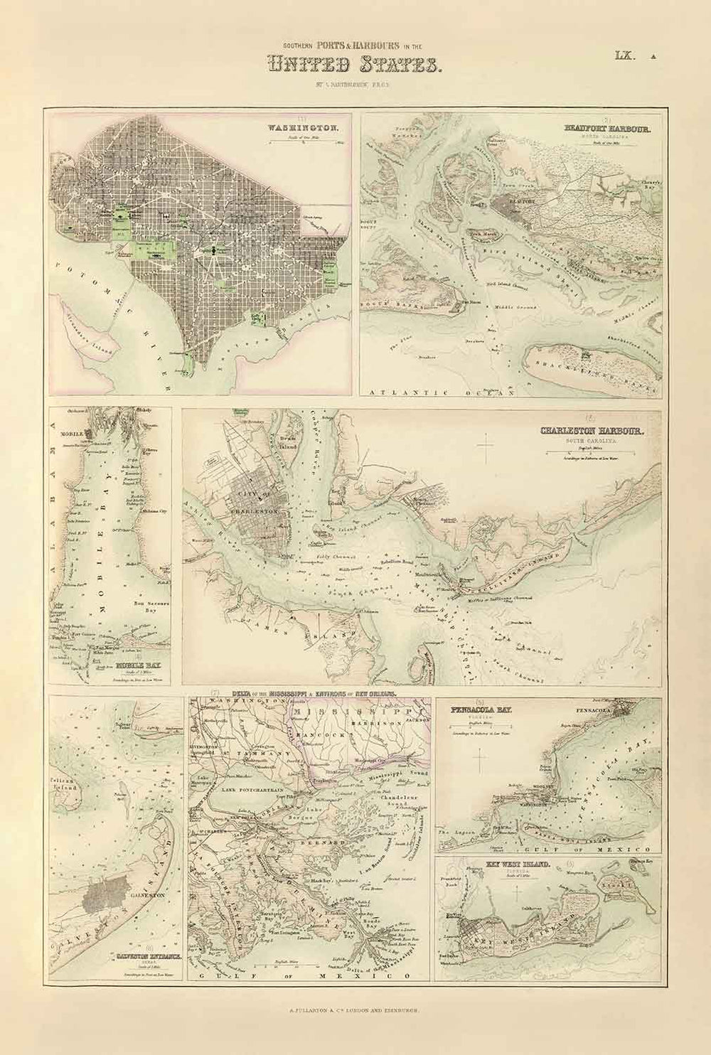 Old Map of the Ports & Harbours in Southern USA, 1872 by Fullarton: Pensacola, New Orleans, Galveston, Key West, Charleston