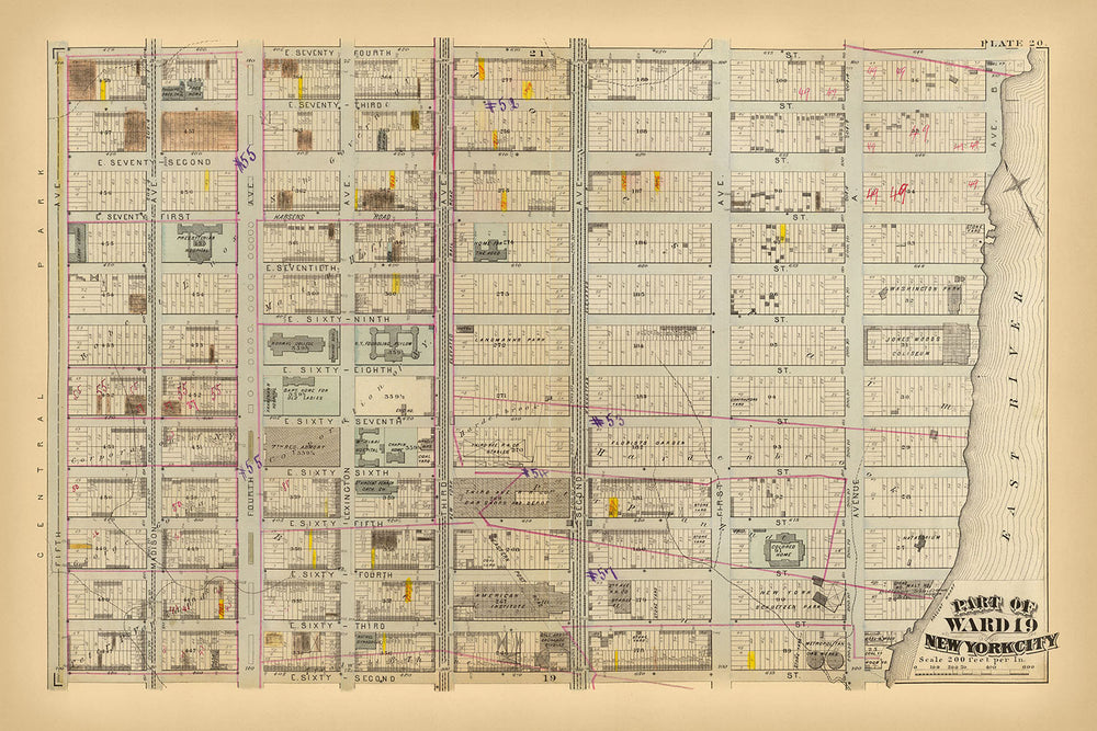 This exquisite 1879 map, titled "Part of ward 19, New York City," is a historic gem by cartographer G.W. Bromley. It offers an incredibly detailed look at part of the Gold Coast, Lenox Hill and Upper East Side of New York City during a time of significant urban development. The hand-colored lithograph reveals the intricate layout of streets, blocks, and notable institutions, providing a unique snapshot of the city's past.
