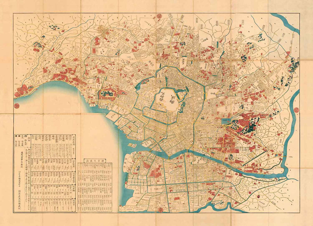 Tokyo was known then as Edo. When this map was published, Japan was ruled by the Tokugawa shogunate, the military government that was based in Edo. However shortly after this map was published, the Edo era ended as a result of the two powerful anti-Tokugawa clans joining forces to topple the shogunate.