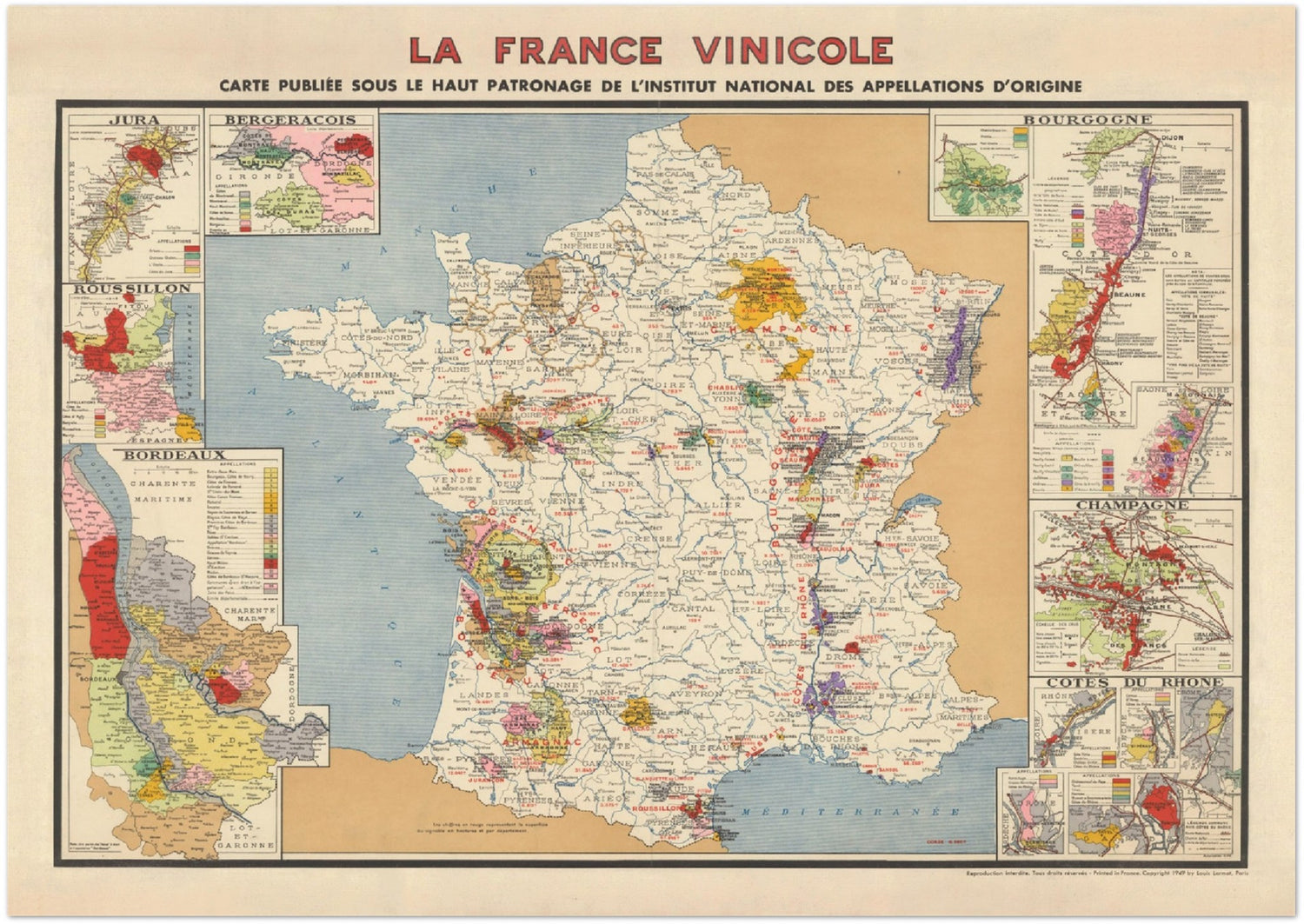 Old Map of Vineyards in France "La France Vinicole", 1939: Bordeaux, Bourgogne, Champagne, Cotes Du Rhone, Bergeracois