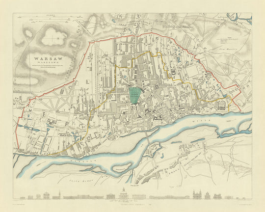 Beyond its aesthetic and historical value, this map is a scholarly artifact that captures Warsaw at the crossroads of autonomy and oppression. It reflects the brief period of self-governance post-Napoleon and preludes the increased Russian influence that would shape much of its 19th-century narrative. The detailed streets and neighborhoods like Nowe Miasto and Stare Miasto are frozen in time, just before the industrial age's full impact and the subsequent scars left by war and Soviet rule.