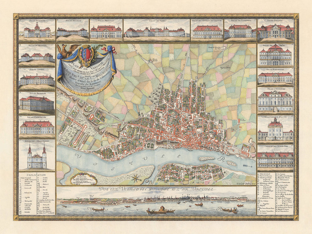 Adorned with illustrations of important buildings and edifices, the map serves as a historical record of Warsaw's architectural heritage. The detailed illustrations around the border include notable landmarks that were central to the city's identity. These visual elements not only enhance the map's aesthetic appeal but also provide valuable insights into the architectural styles and significant structures of the time.