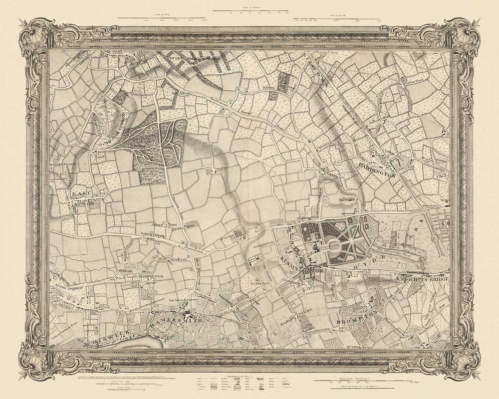Old Map of West and Central London in 1746 by John Rocque: Hamersmith, Kensington, Hyde Park, Knightsbridge, Shepherd's Bush, SW3,SW5, SW7, W2, W6, W10, W12, W14, NW8