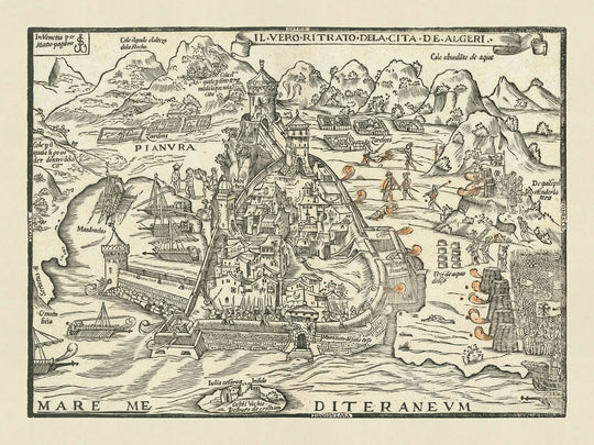 Discover a rare gem from the annals of history with "Il Vero Ritrato Dela Cita De Algeri," a captivating woodcut map crafted by the esteemed Venetian engraver Matteo Pagano in 1542. This exquisite piece captures the essence of the 1541 Siege of Algiers, a pivotal moment when Charles V of the Holy Roman Empire attempted to wrest control of Algiers from the Ottoman Empire. Pagano's map offers a detailed portrayal of the city, surrounded by formidable fortifications and teeming with the vibrancy of a bustling port. The map's intricate design invites you to explore the rich tapestry of history woven into its very fabric.