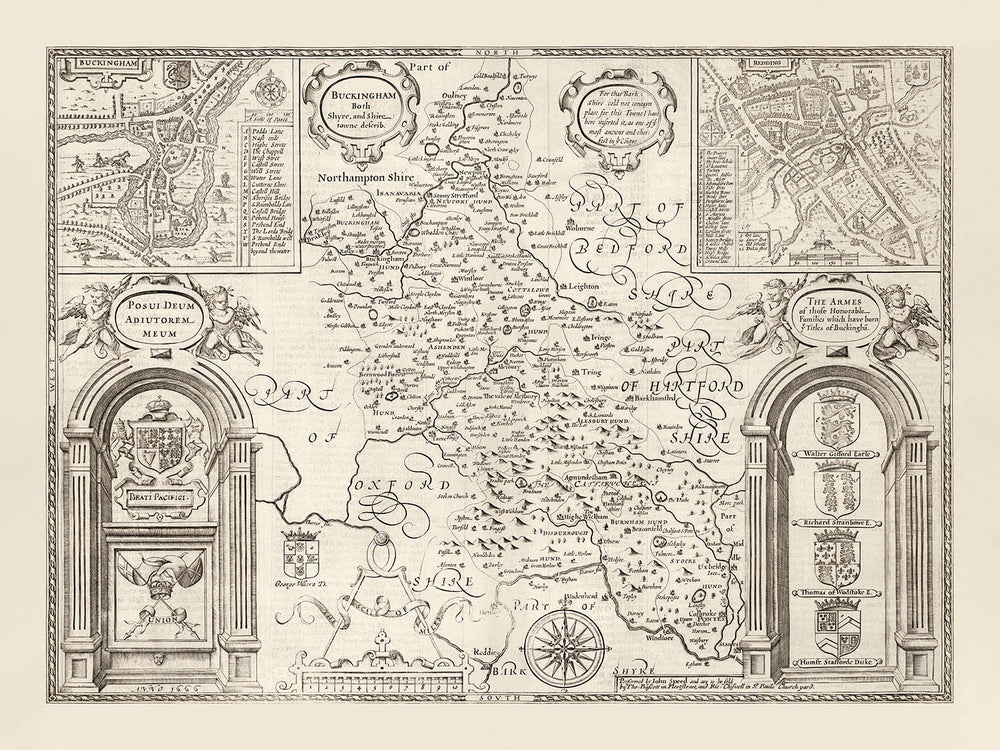 Old Monochrome Map of Buckinghamshire in 1611 by John Speed: High Wycombe, Amersham, Buckingham, Milton Keynes