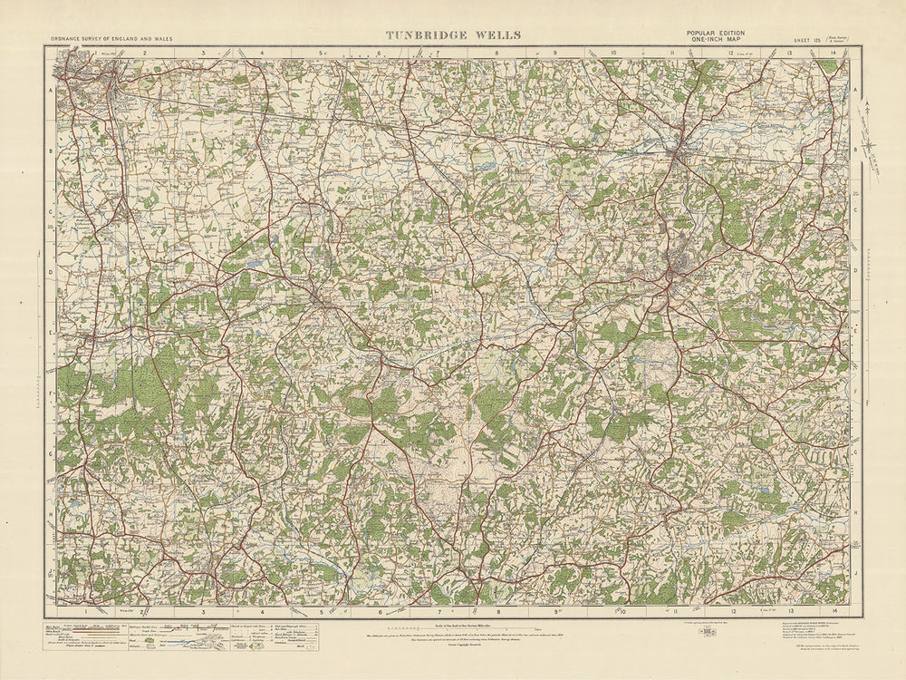This vintage map, titled "Sheet 125 - Tunbridge Wells," is an authentic piece from the renowned Ordnance Survey's One-inch "Popular" edition of England and Wales, published in 1925. The map showcases a wealth of historical information, capturing the landscape and settlements of the time. The product title highlights the main towns, cities, and interesting features depicted on the map, excluding Tunbridge Wells itself.