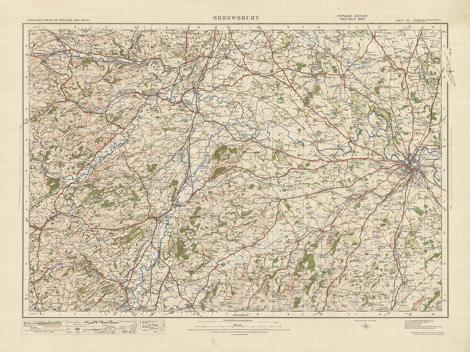 This remarkable product is an original copy of the Ordnance Survey's One-inch "Popular" edition map, specifically Sheet 60 - Shrewsbury, published in 1925. The map showcases various towns, cities, and captivating features, providing a fascinating glimpse into the past. Notably, it includes the historic county town of Shrewsbury, situated in Shropshire, England.
