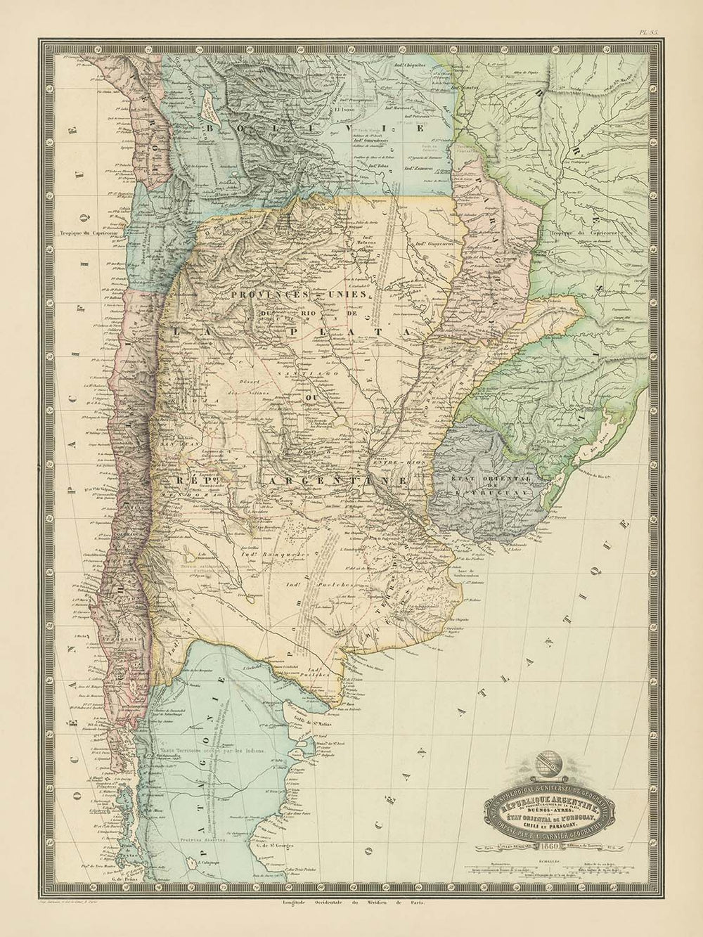 Step into the vibrant world of 19th-century South America with F.A. Garnier’s masterful 1860 creation, "Republique Argentine Du Provinces-Unis De La Plata, Buenos-Ayres, Etat Oriental De L'Uruguay, Chile et Paraguay." This exquisitely detailed map offers a rare window into a continent in the throes of transformation, capturing the geopolitical boundaries and natural wonders of Argentina, Patagonia, Chile, Uruguay, Paraguay, Bolivia, and the fringes of Brazil and Peru. Garnier’s signature decorative vignette graces the title, immediately setting the tone for a work that is as much a piece of art as it is a historical document.