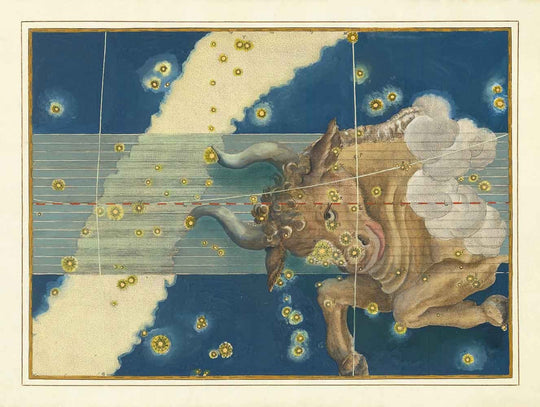 A stunning and exceptionally rare handcoloured celestial chart of the zodiac constellation Taurus, The Bull with all of the stars picked out in gold.