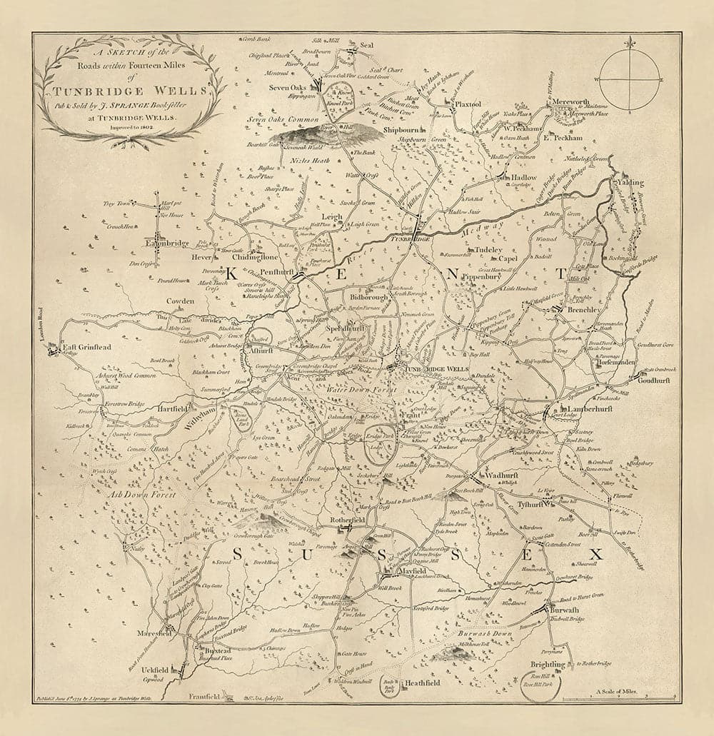 This charming map shows the roads within 14 miles of Tunbridge Wells in Kent. This map dates to 1802.
