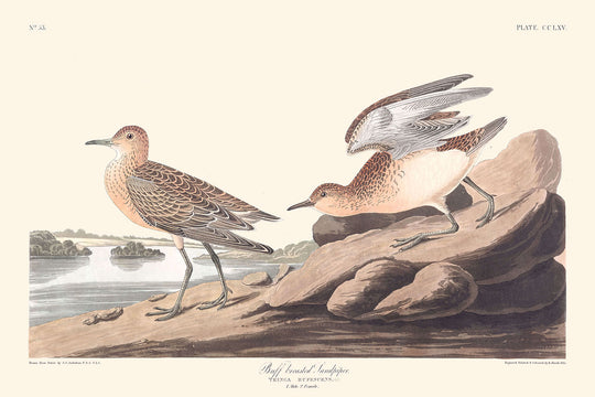 Buff Breasted Sandpiper (Plate 265), first published in 1827, is one of the most detailed and exquisite bird illustrations from John James Audubon’s renowned series, Birds of America. This captivating piece showcases the Buff Breasted Sandpiper in two distinct poses, capturing their unique beauty and the intricate details of their plumage.