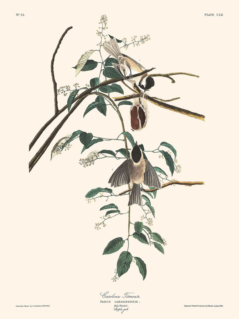 Carolina Titmouse, illustrated by the renowned John James Audubon, is an exquisite portrayal from his seminal work, Birds of America, first published in 1827. This illustration beautifully captures the allure and distinctiveness of Avian art, vividly bringing to life this charming species.