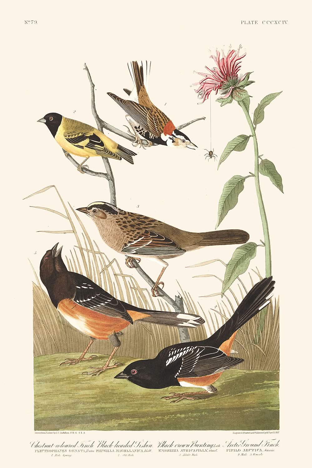 Step into the world of ornithology and natural beauty with "Chestnut-coloured Finch, Black-headed Siskin, Black crown Bunting, Arctic Ground Finch," a remarkable bird illustration from John James Audubon's acclaimed Birds of America series. Created in 1827, this exquisite piece captures the delicate grace and intricate feather patterns of these birds, brought to life through Audubon's masterful artistry. Audubon’s work is a cornerstone of American wildlife studies, offering an intimate glimpse into the diverse avian species known during his time.