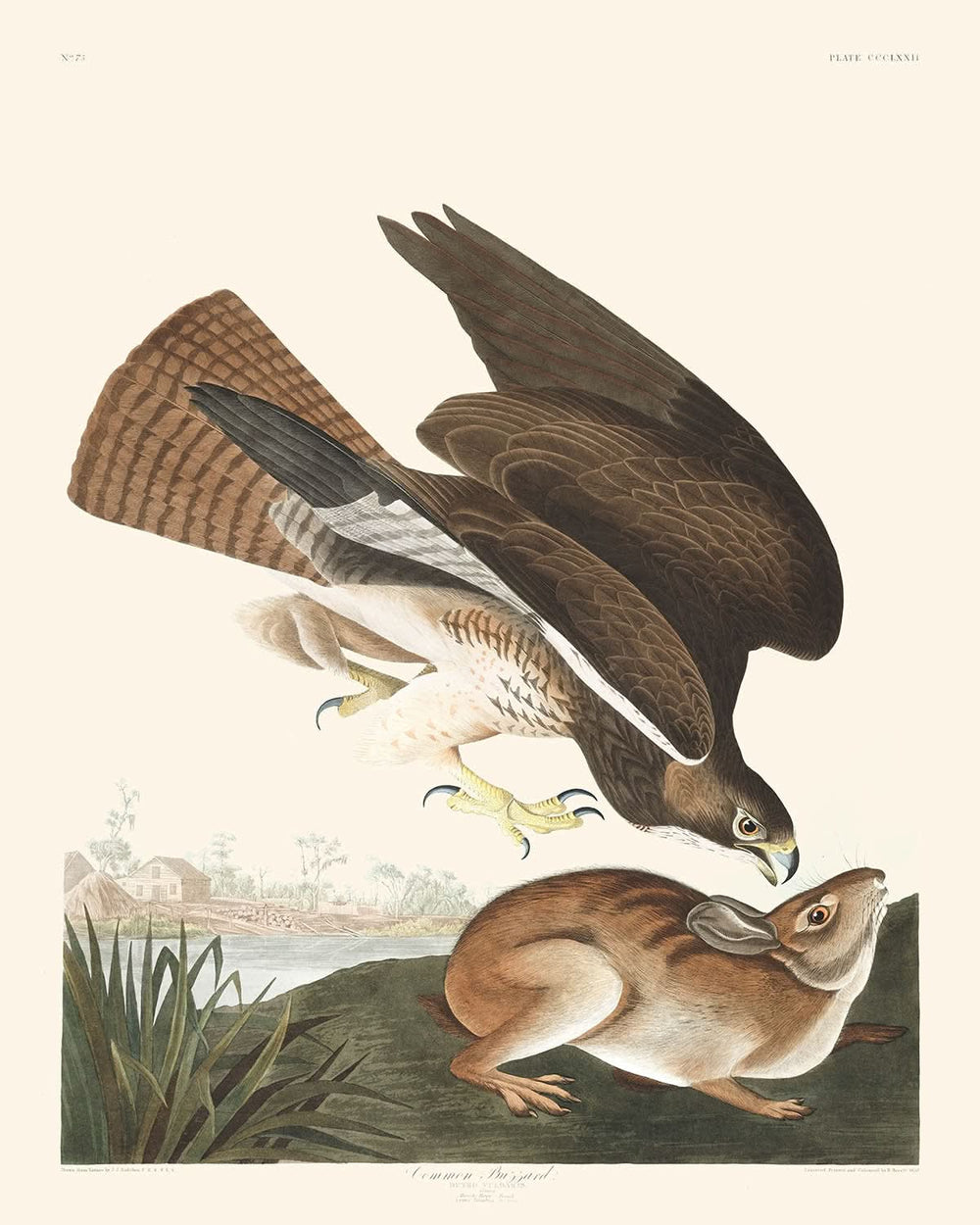 Common Buzzard, a work first published in 1827 by renowned artist John James Audubon, is a significant illustration from the magnum opus "Birds of America." This captivating image presents the enigmatic Common Buzzard, known scientifically as Buteo vulgaris, captured with remarkable precision and lifelike detail, reflecting Audubon's keen eye for ornithological artistry.