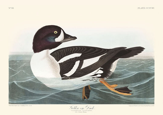 Golden-Eye Duck (Plate 403) by John James Audubon, first published in 1827, is a masterful bird illustration from Audubon's acclaimed series, Birds of America. This collection showcases a profound exploration of American avifauna, where the Golden-Eye Duck illustration stands out due to its vibrant depiction and the narrative detail of its subject's natural history.