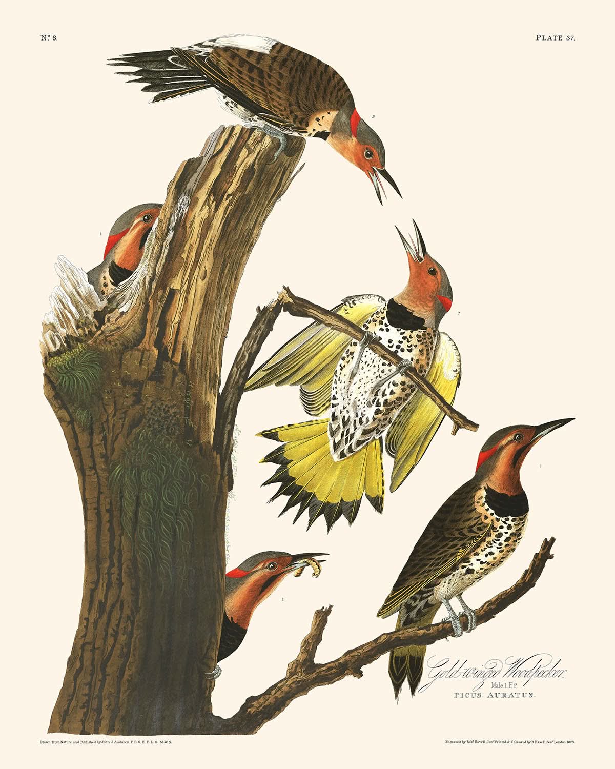This print is not just a celebration of avian beauty but also an invocation of the natural world's pleasure and science. With its robust and detailed imagery, owning this artwork is an invitation to explore Audubon's observations on the habits and peculiar characteristics of the Golden-winged Woodpecker, or Picus auratus.