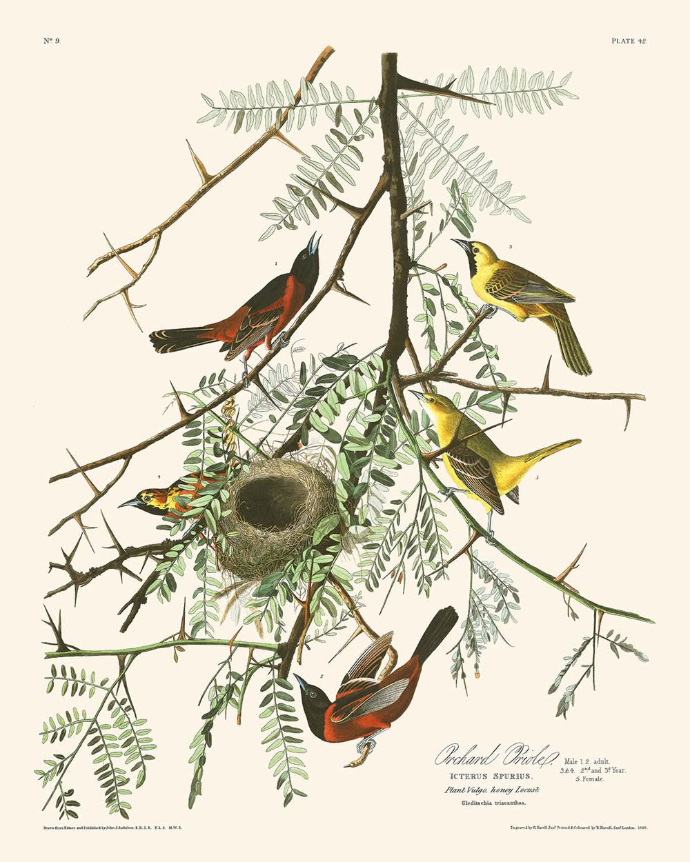This splendid illustration appeals not just for its ornithological significance but also for its visual elegance. One could marvel at the dynamic posture of the oriole poised against the honey locust, a testament to Audubon's talent at blending botanical elements with avian life. The knowledgeable naturalist or art lover would assert it as both an enriching addition to home décor and a source of inspiration for learning about the entwined stories of nature and art.
