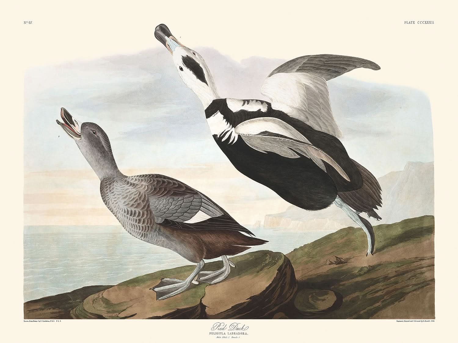 John James Audubon’s enchanting illustration "Pied Duck" from 1827, more than just an artwork, is a vibrant exploration into the avian world depicted in his seminal series, Birds of America. This illustration captures the vivid presence of the Pied Duck, reflecting a unique exploration undertaken by Audubon’s son in Labrador. While the nests of this species were found nestled atop low fir-bushes at Blanc Sablon, the Pied Duck's portrayal here casts a rare glimpse into its natural habitat and seasonal habits—details gleaned from extensive observations by Audubon and his learned associates.