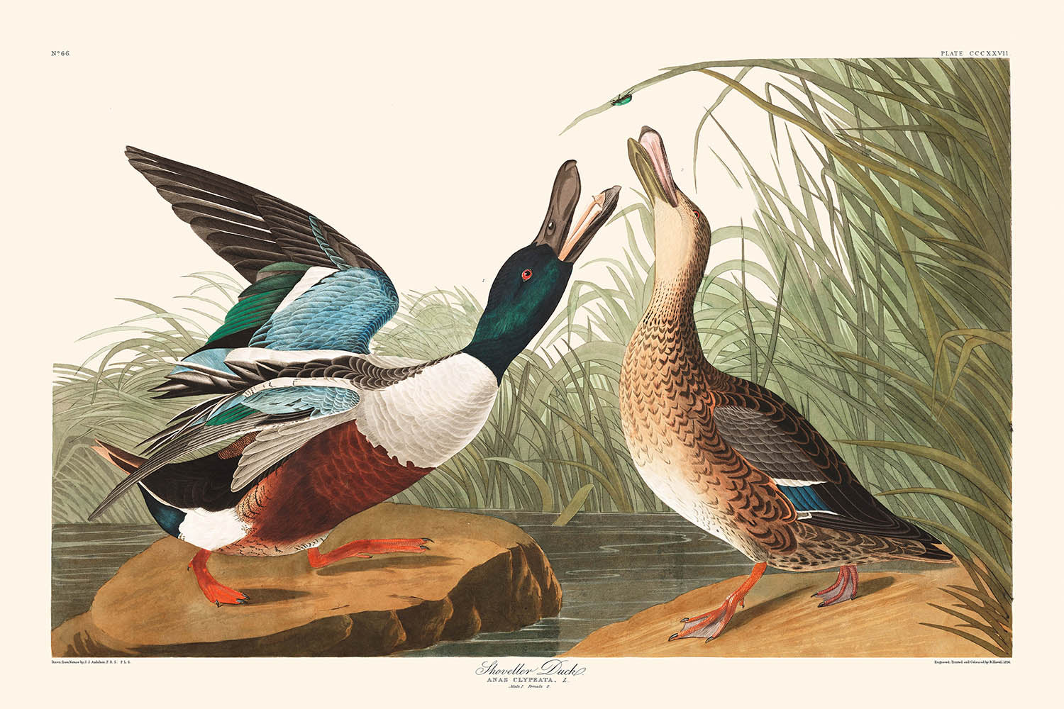 John James Audubon's illustrious "Shoveller Duck" from his acclaimed collection, "Birds of America," offers an insightful glimpse into early American ornithological artistry. Created in 1827, this piece is not merely a depiction of wildlife; it is an elaborate tale that interwoven with the rich ecological landscape of 19th century America, capturing nature's intricate beauty through Audubon's scientific lens.