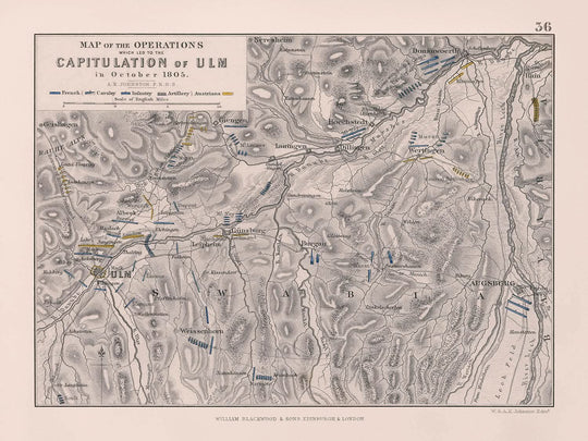 The "Map of the operations which led to the Capitulation of Ulm in October 1805" by the renowned geographer AK Johnston is more than just a depiction of historical military maneuvers; it is a testament to cartographic artistry of the early 19th century. This exquisite hand-colored lithograph, created in 1805, skillfully outlines the pivotal positions of the French and Austrian forces during one of the decisive battles of the Napoleonic Wars. Each unit—cavalry, infantry, and artillery—is meticulously captured, providing a vivid snapshot of history through strategic planning and topographical genius.