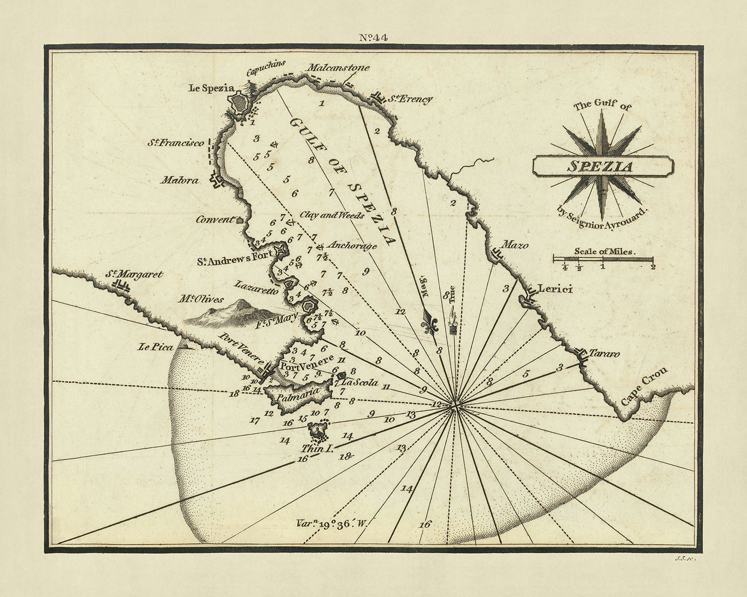 Old Gulf of La Spezia Nautical Chart by Heather, 1802: Cinque Terre, Italian Riviera, Porto Venere, Lerici,