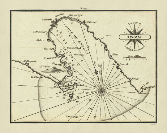 William Heather's contribution to cartography, particularly with his "New Mediterranean Pilot," from which this chart is taken, marked a significant English contribution to Mediterranean mapping. The charts from this pilot are exceedingly rare, making "The Gulf of Spezia" a prized collector's item. Heather's meticulous approach and the artistic finesse of Stephenson’s engraving provide a map that is not only useful but also aesthetically pleasing, a true artifact of its time.