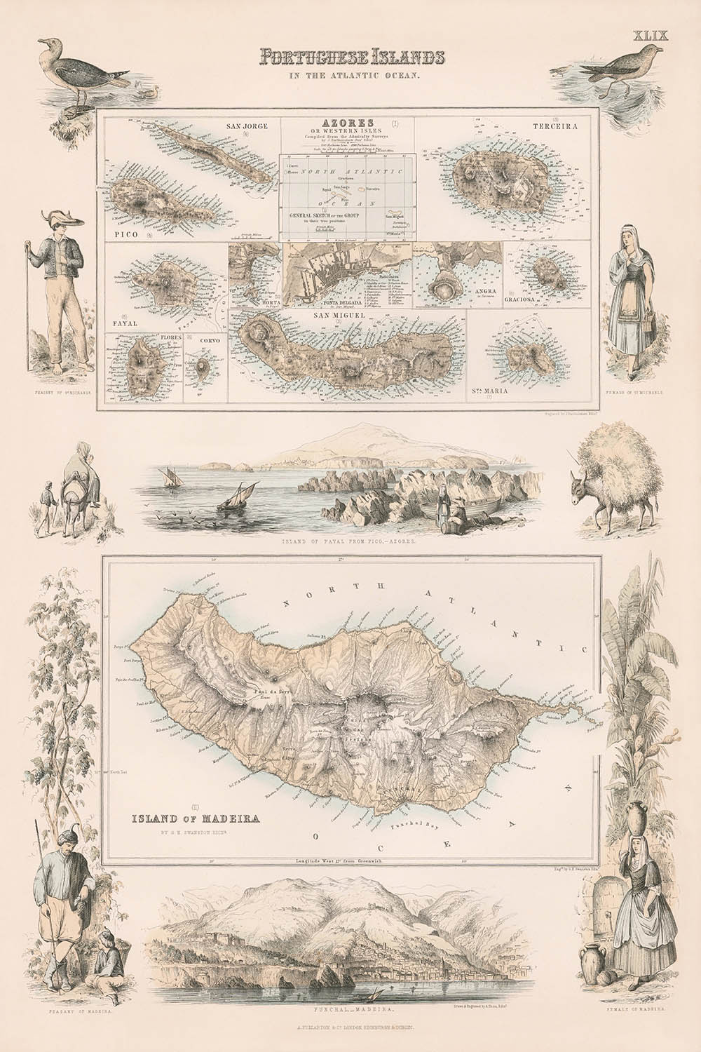 The map showcases the diverse landscapes of the Portuguese islands, with intricate illustrations of the island of Fayal from Pico in the Azores and a detailed depiction of Funchal on Madeira. The vignettes that adorn the edges of the map add a layer of cultural richness, portraying local fauna, flora, and the people of the islands. These artistic elements provide a vivid context to the geographical data, making the map both informative and visually captivating.