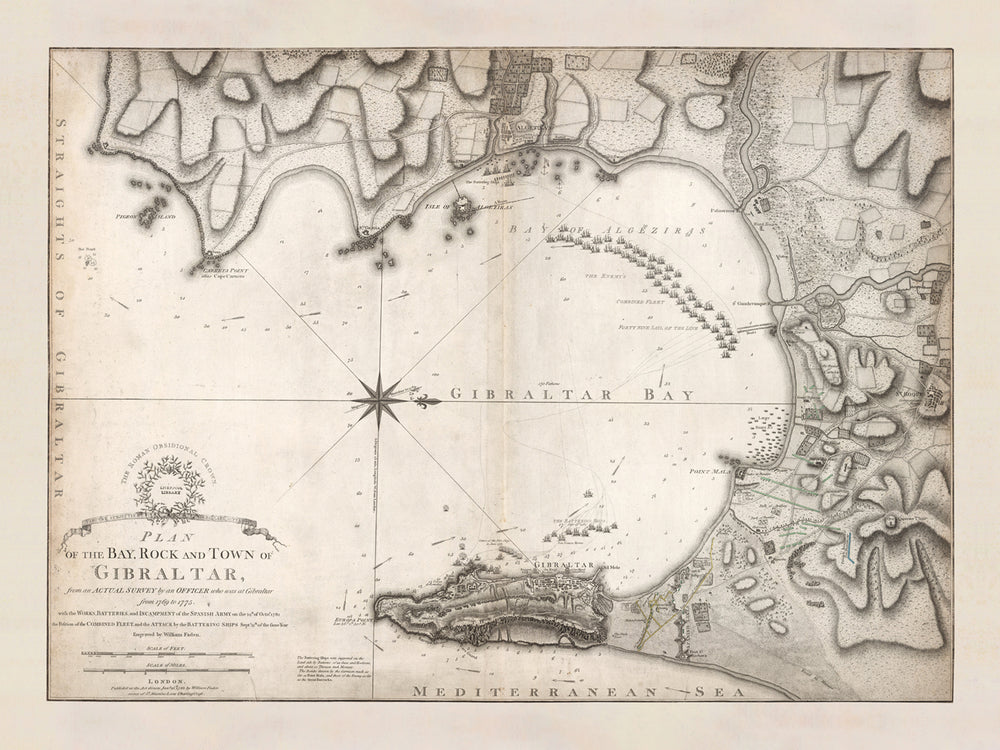 Old Map of Gibraltar by William Faden, 1775: Gibraltar Harbor, Catalan Bay, Europa Point, the Rock of Gibraltar, Alameda Gardens