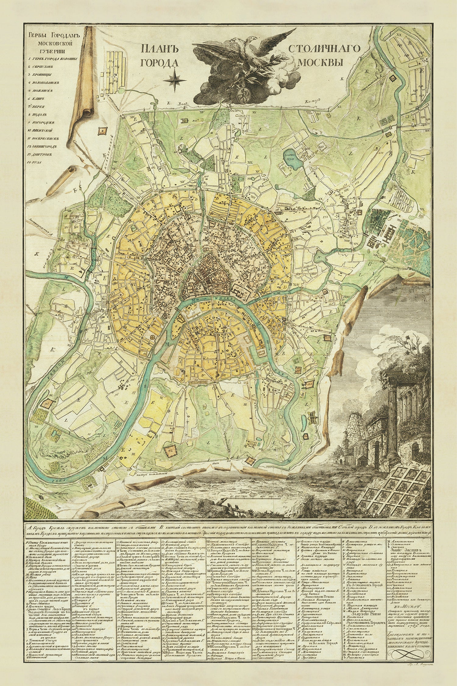 Old Map of Moscow by Ivan Marchenkov, 1789: Kremlin, St Basil's Cathedral, Red Square, Moskva River, Zamoskvorechye