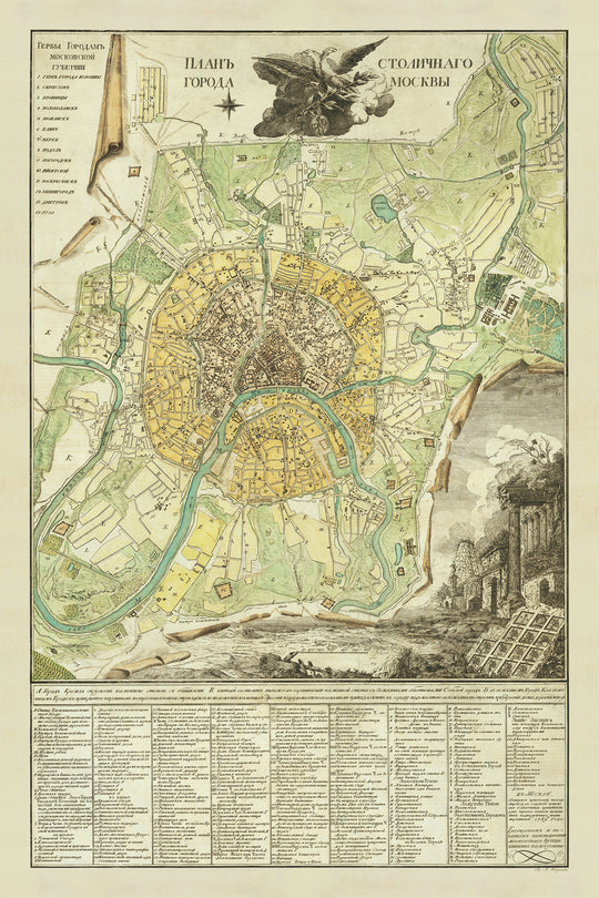 This rare and fascinating map of Moscow was created by Ivan Marchenkov in 1789. It depicts the city in great detail, showing its streets, buildings, and waterways. The map is also adorned with beautiful illustrations of some of Moscow's most iconic landmarks, such as the Kremlin, the Moscow River, and the Yauza River.