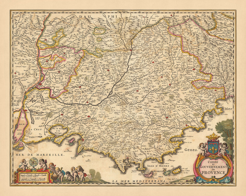 Old Map of Provence, France by Visscher, 1690: Marseille, Avignon, Cannes, Nice, Parc national des Calanques