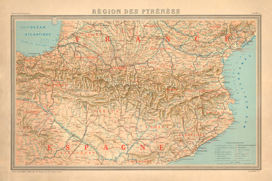 Old Map of the Pyrenees Mountains, 1920: Southern France and Northern Spain