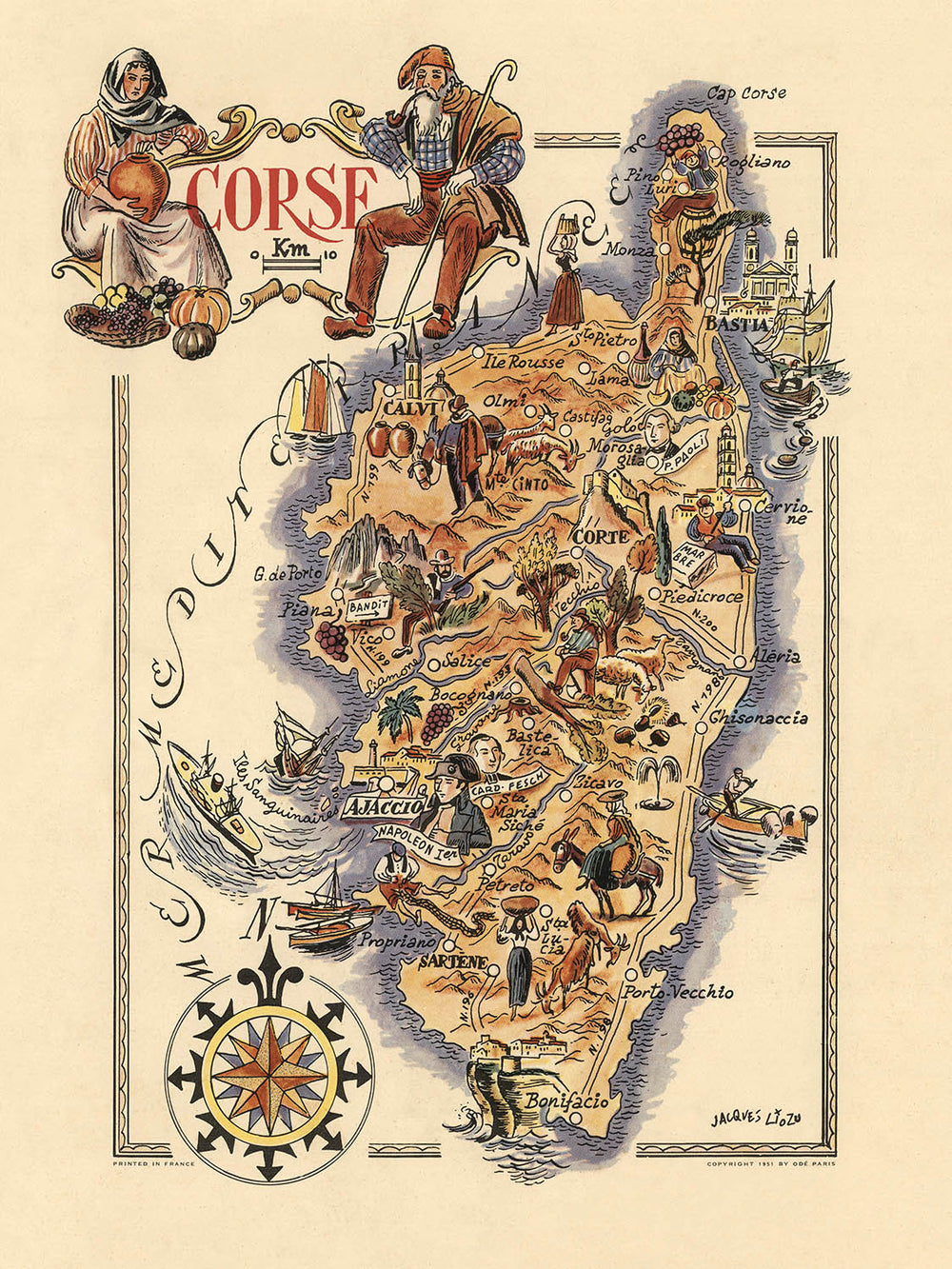 - Historical significance: This map provides a mid-20th-century perspective on Corsica, highlighting its cultural and historical landmarks, and offering insight into the artistic cartographic practices of the time.